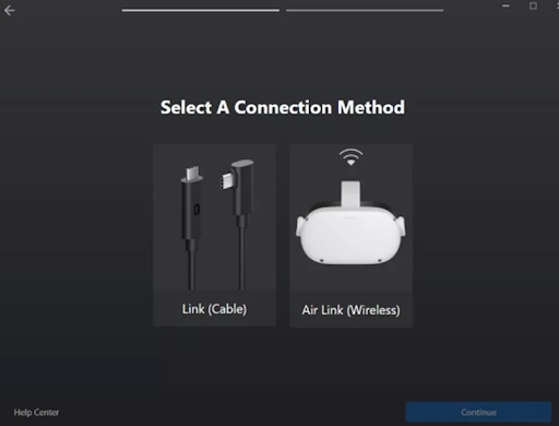 在Meta Quest应用程序中,按“继续”。在下一个出现的屏幕上,你可以选择测试你的电缆连接,或者按“继续”。